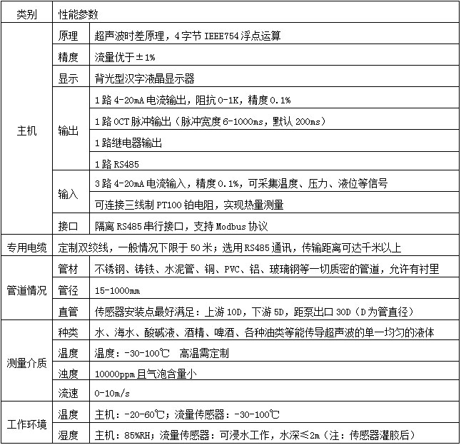 法蘭一體式超聲波流量計采用管段式流量傳感器,具有精度高、量程比寬、無壓力損失、安裝簡單等特點,操作方便、采用磁棒在主界面進行菜單操作,能自動記憶歷史數據;壁掛式超聲波流量計應用于各種液體的長期在線測量,主機是壁掛式,流量傳感器安裝在管道上,有多種流量傳感器供選擇,是目前應用最廣泛的超聲波流量計;手持式、便攜式超聲波流量計是為了提高流量測量的方便性而設計的,多用于臨時檢測,體積小、重量輕,通常選用非接觸式、外夾式傳感器,加配數據存儲器SD卡,方便日后上傳數據、統計、分析等,便攜式超聲波流量計可內置打印機,可實現即時、定時打印,參數如下:
