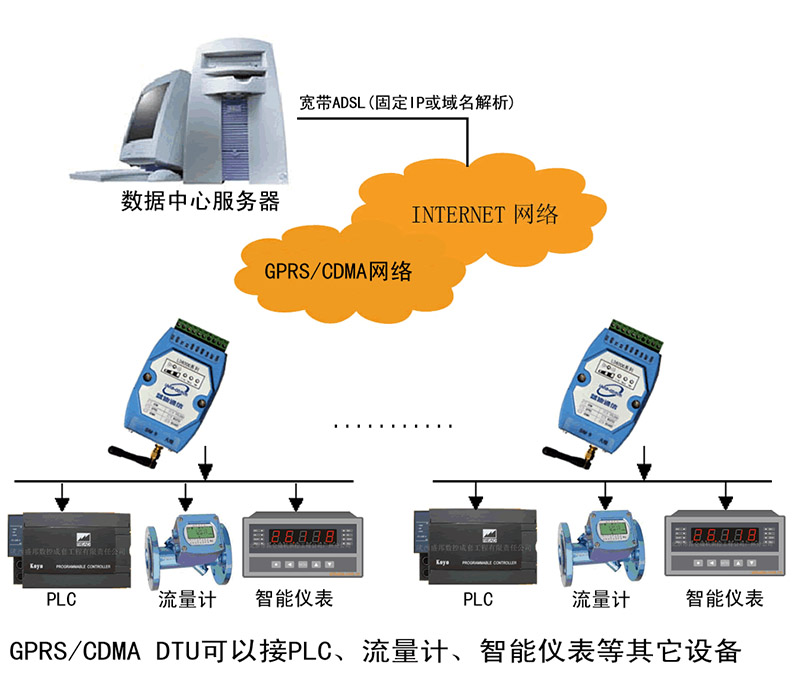 無線抄表系統是由中心服務器、無線抄表管理軟件、現場計量儀表(如渦街、電磁等)、GPRS DTU數傳模塊及其它附件構成。中心服務器接入有多種方式,推薦“中心服務器固定IP地址,監控點直接向中心發起連接的方式。”
